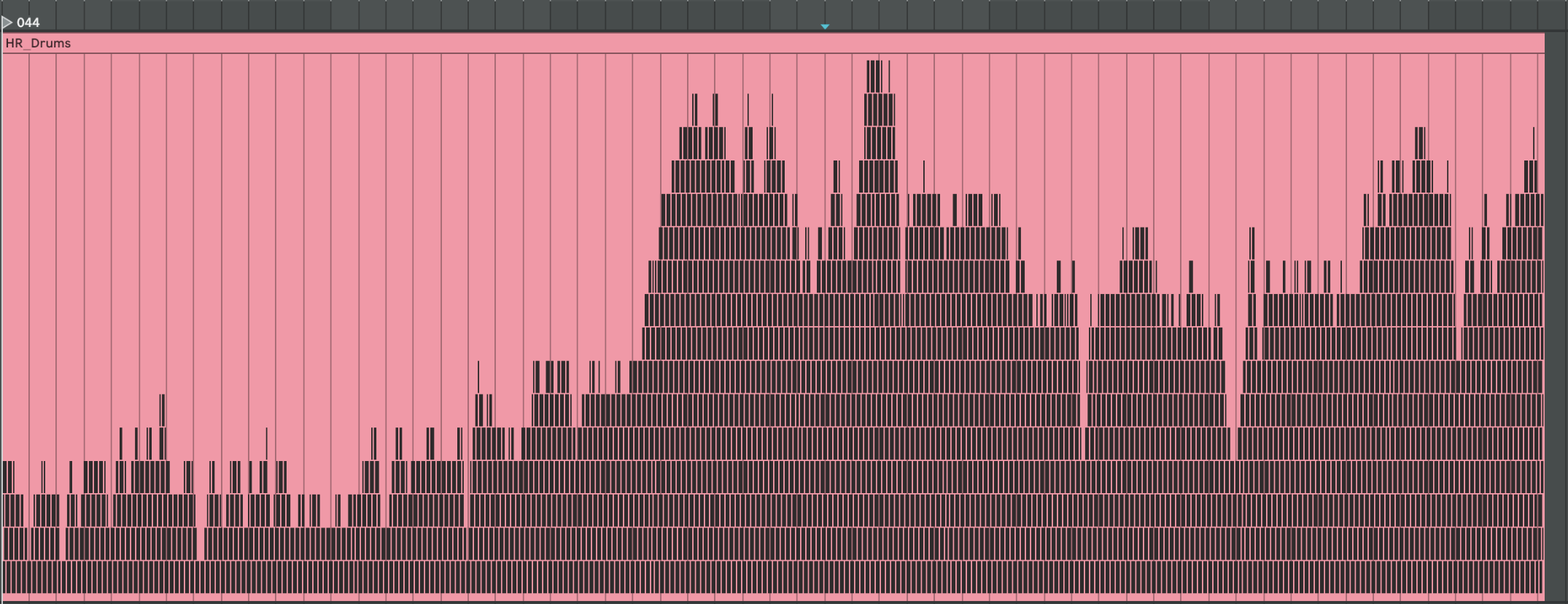 To generate heart-rate–driven drums I set out to write a script that builds a drum pattern whose density depends on HR intensity. I fixed the tempo at 75 BPM because the math is convenient: 0.1 s of data ≈ one 1/32-note at 75 BPM. I pictured a bar with 16 cells and designed a map that decides which cell gets filled next; the higher the HR, the more cells are activated. Before rendering, a helper scans the global HR minimum and maximum and slices that span into 16 equal zones (an 8-zone fallback is available) so the percussion always scales correctly. For extra flexibility, the script also writes SDNN and RMSSD into the MIDI file as two separate CC automation lanes. In Ableton, I can map those controllers to any parameter, making it easy to experiment with the track’s sonic texture.