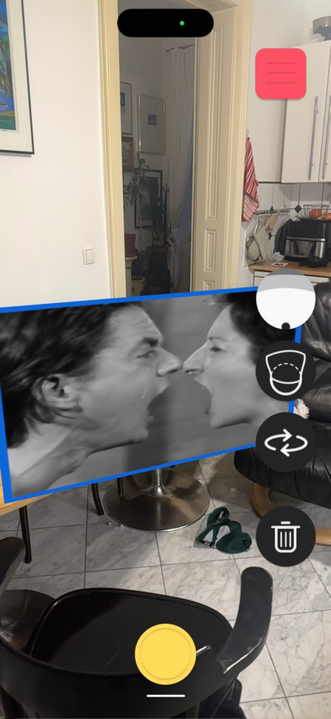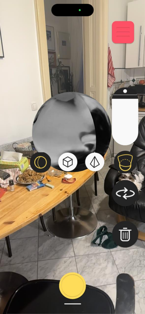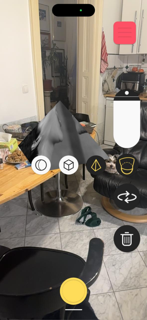 Here we can see that the original cone shape can be changed and adjusted directly in the AR environment. Both the form and its position are flexible, which makes it possible to adapt the object to the space. The sound linked to the cone was initially too loud, so finding the right placement was important to make the audio feel balanced. After adjusting the position, the sound worked as intended. However, the experience later became glitchy, and the object can no longer be accessed or edited in the same way as before, which shows some technical instability in the system. We also have the option of recording it with this app.
