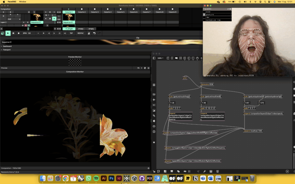 Since the flower has to respond to people, I used FaceOSC to track facial movements, interpreting gestures and expressions. A Max 9 patch to process this incoming data and map it to decay parameters. UDPsend to push the control signals directly to Resolume Arena, where the flower video lives. Resolume became the decay environment. As a viewer approaches or moves, the flower visuals begin to glitch, shake and distort.
