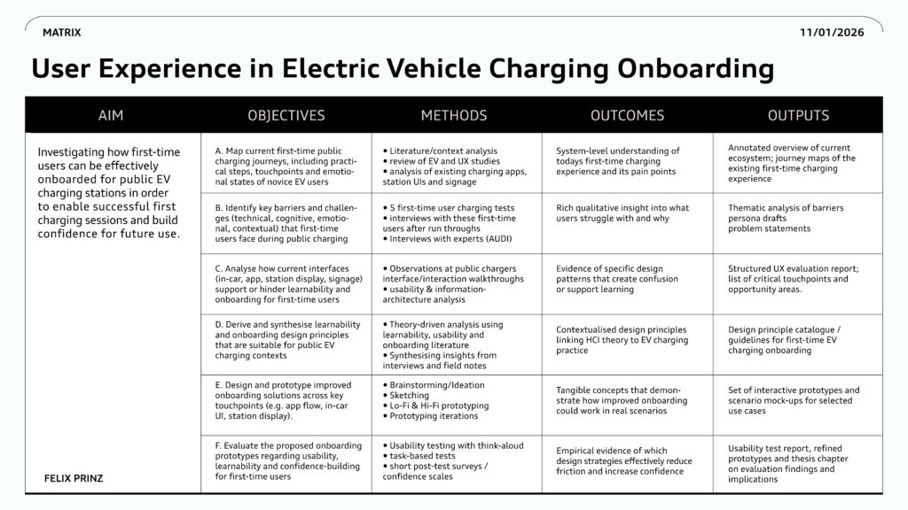 This master project explores how first‑time users can charge an electric car at public charging stations in a simple and confident way. I focus on the Audi UI and look at the whole journey: finding a charger in the app, using the in‑car system and interacting with the charger on site. With interviews, observations and usability tests, I study where people get stuck, feel stressed or unsure. The matrix in the image shows how my aims, objectives, methods and expected outcomes connect and guide the design of better onboarding experiences.