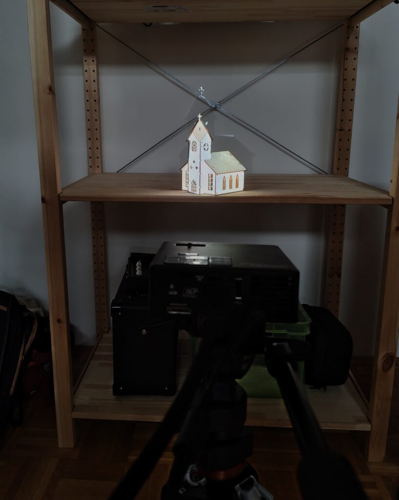 Nachdem die Bauteile für die Modellkirche eingetroffen waren, wurden sie zusammengesetzt, wodurch ein verkleinertes Modell einer Kirche aus Holz entstand. Die Struktur des Holzes erwies sich als leicht faserig mit einem gelblichen Ton. In diesem Zusammenhang stellte sich die Frage, ob ein Anstrich in Weiß vorteilhaft wäre, insbesondere falls sich die ersten Mapping-Tests als nicht erfolgreich erweisen sollten.