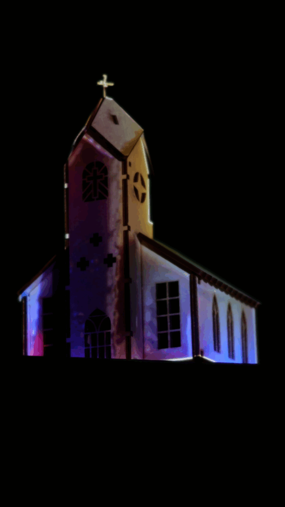 Nach der Fertigstellung des Modells soll dieses mithilfe eines Beamers projiziert und durch Videomapping visuell bespielt werden. Hierfür ist der Einsatz eines Kurzdistanzprojektors oder eines kleinen mobilen Beamers vorgesehen, um maximale Flexibilität bei der Aufstellung und Projektion zu gewährleisten. Ziel dieser Projektionen ist es, verschiedene Techniken, Farben, Texturen, Animationen und Visualisierungen auf die Miniaturkirche anzuwenden, um deren Wirkung auf die Oberflächenstruktur und die architektonische Gestaltung zu untersuchen. Besonders relevant ist hierbei die Frage, wie Licht auf Architektur wirkt und inwieweit Projektionen als erweiterte Gestaltungsebene dienen können.