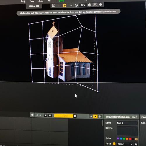 Der Projektor wurde mit dem Laptop verbunden und die Modellkirche so positioniert, dass eine möglichst hohe Pixeldichte erreicht wurde, ohne die Proportionen des projizierten Bildes zu verzerren. Anschließend wurden in der Software HeavyM erste Masken erstellt, zunächst rudimentär für die Dächer, Fenster und Seitenteile. Unterschiedliche Shader wurden angewendet, variiert in Helligkeits- und Geschwindigkeitsstufen, um die Lesbarkeit und Klarheit der Projektion auf dem Modell zu evaluieren.