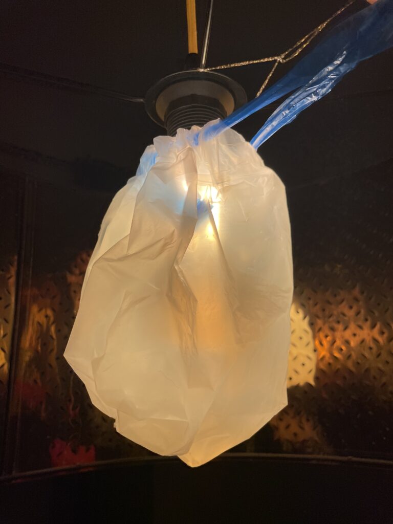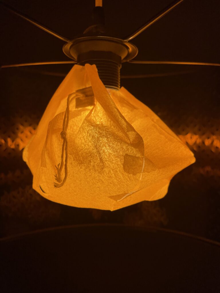 My vision was to use something partly seethrough, with a warm colour, to cover the bright white lightbulb with. It could be fabric, paper or anything with these attributions. I found inspiration in chinese paper lanterns, which always gives a warm and cozy vibe.