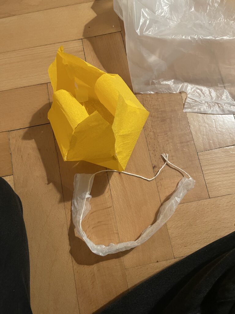 My first prototype was made of a trashbag and tape, and was made in 2 minutes. This was to test functionality of the tightening mechanics.