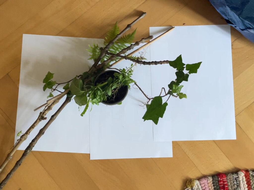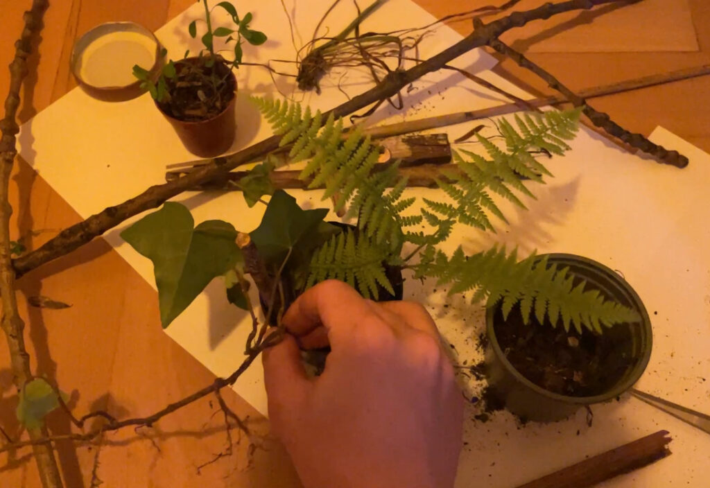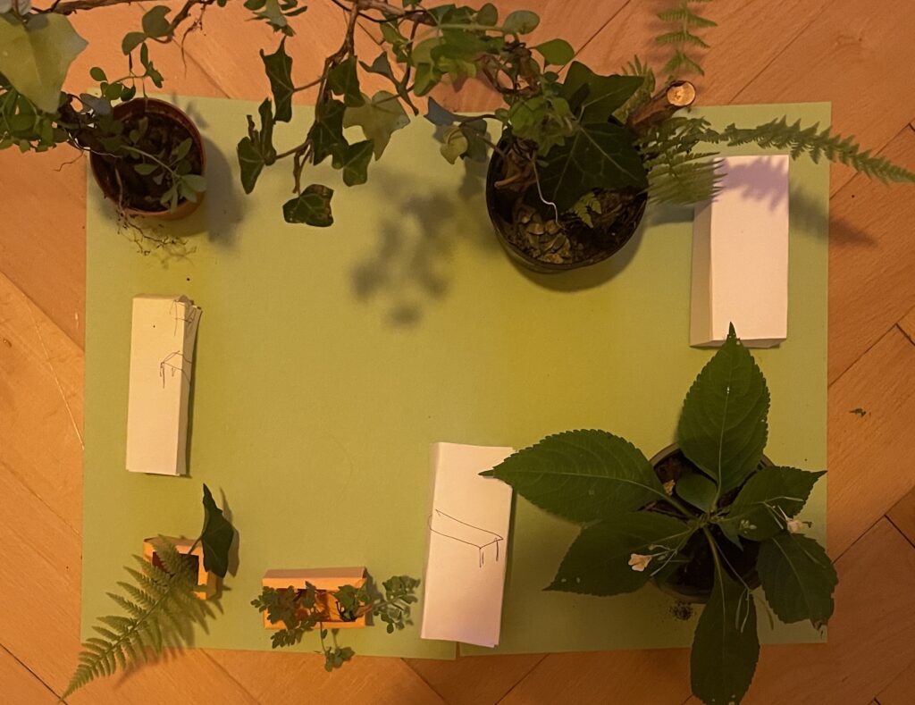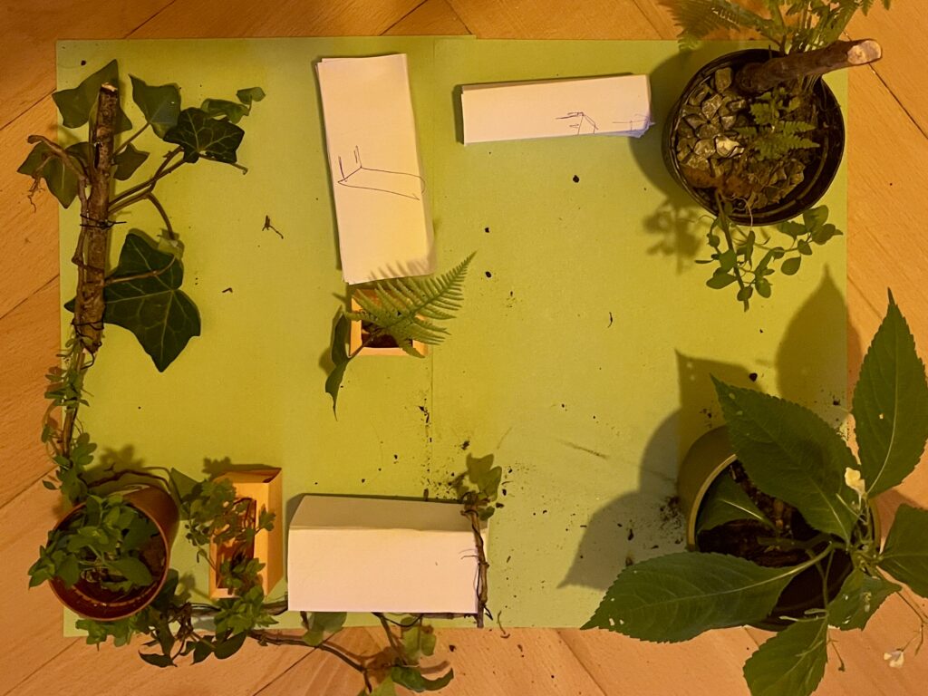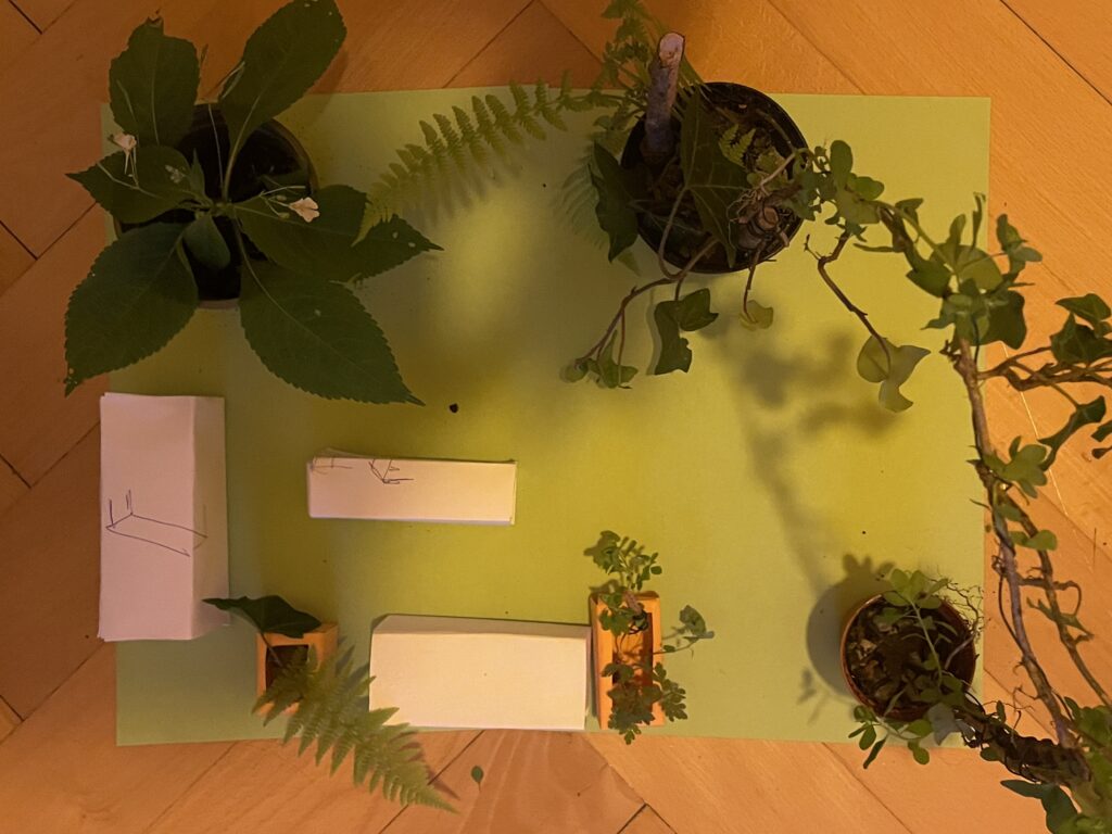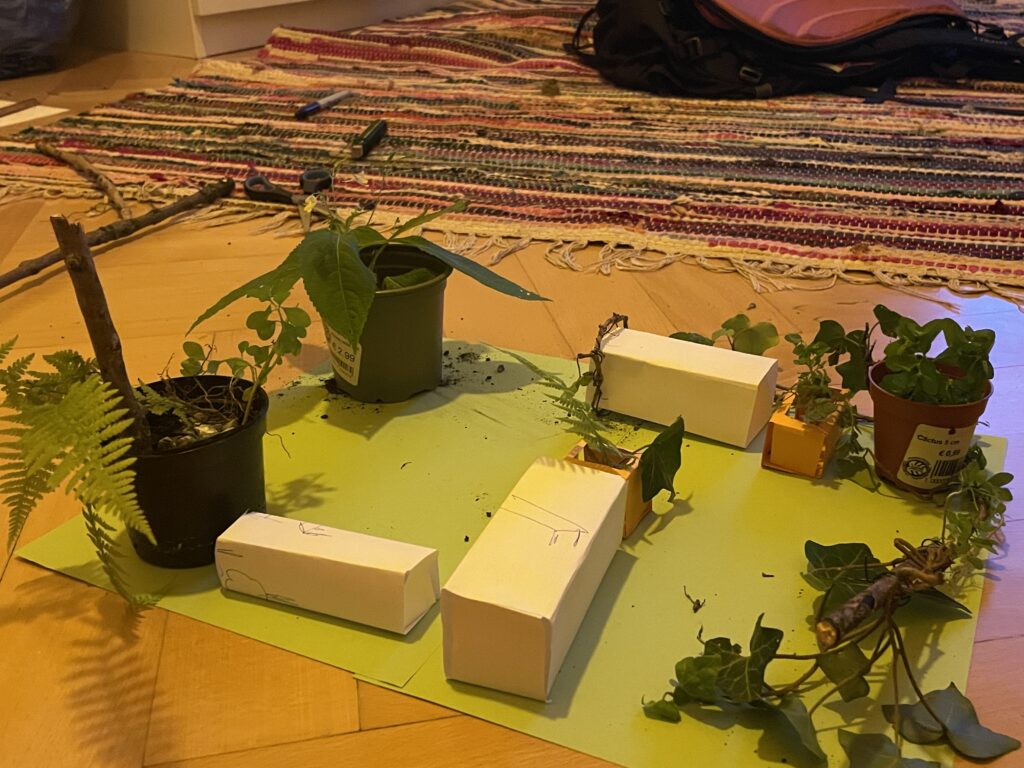 For the second prototype, I really wanted to use real life things, but especially found things. My vision was that with different textures, colours and actual plants, the idea of the modules could become more real. Therefore, I went down in the backyard of my apartment and gathered everything I could find from sticks, plants and trash. I found this part of the process especially fun, since I have a profound love for miniature things and figures. Like, I LOVE lego and small model worlds – I think I need to get myself a terrarium because THE SMALL PLANTS? Love it.
