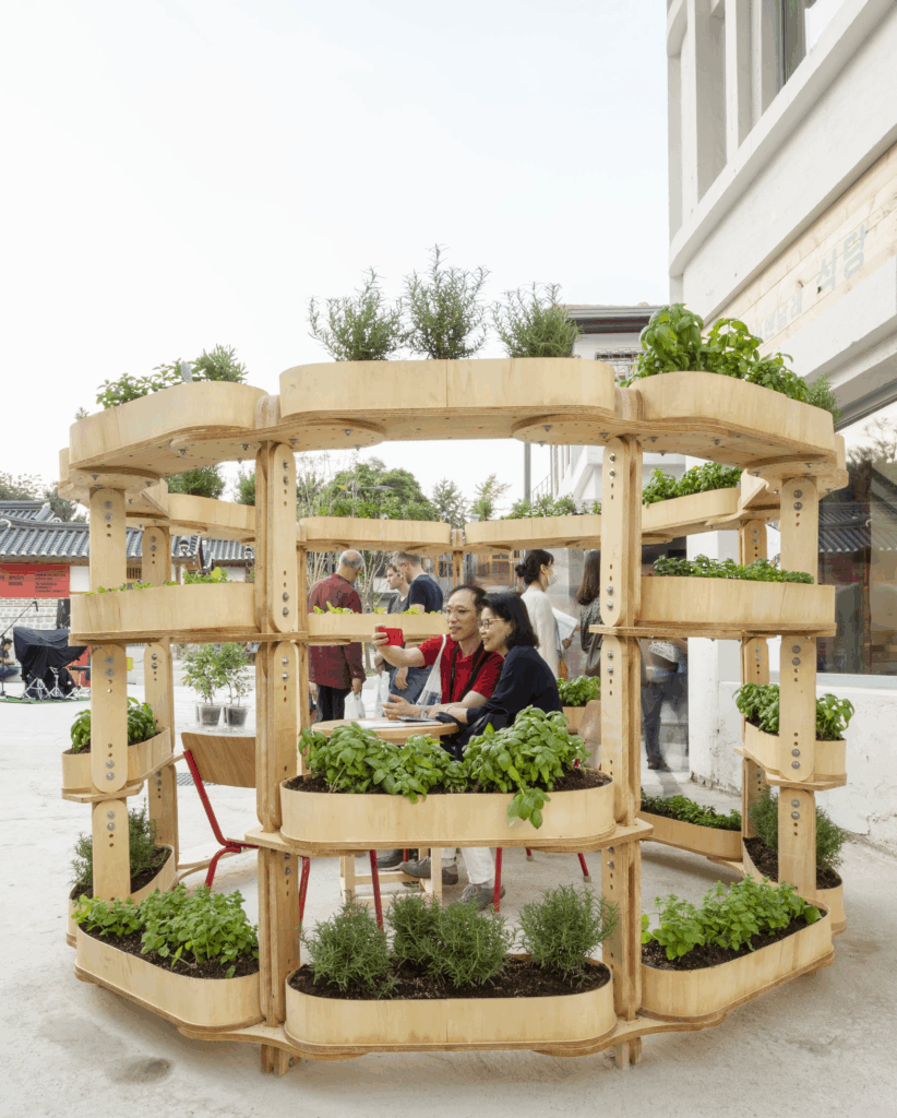 Other inspiration is “Grow more”, a modular urban gardening set that accommodates a hangout area:
