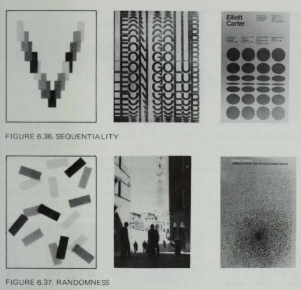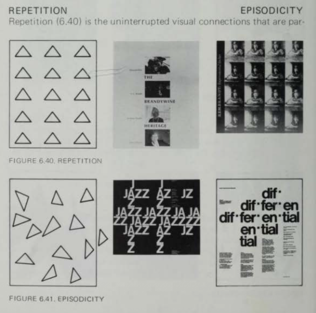 Repetition bezeichnet die wiederholte Verwendung gleicher oder ähnlicher visueller Elemente – Formen, Farben, Motive oder Bewegungen. Durch Wiederholung entsteht Rhythmus, Zusammenhalt und Vorhersagbarkeit. Das visuelle System wirkt stabil, kohärent und leicht wiedererkennbar. Episodicity steht für das Gegenteil: visuelle Ereignisse treten vereinzelt oder sprunghaft auf, ohne klare Wiederholungslogik. Die Wahrnehmung ist fragmentiert, jedes Element wirkt wie ein einzelnes „Ereignis“. Bedeutung entsteht punktuell statt systemisch. (Vgl. Dondis, 1973, pp. 126-127).