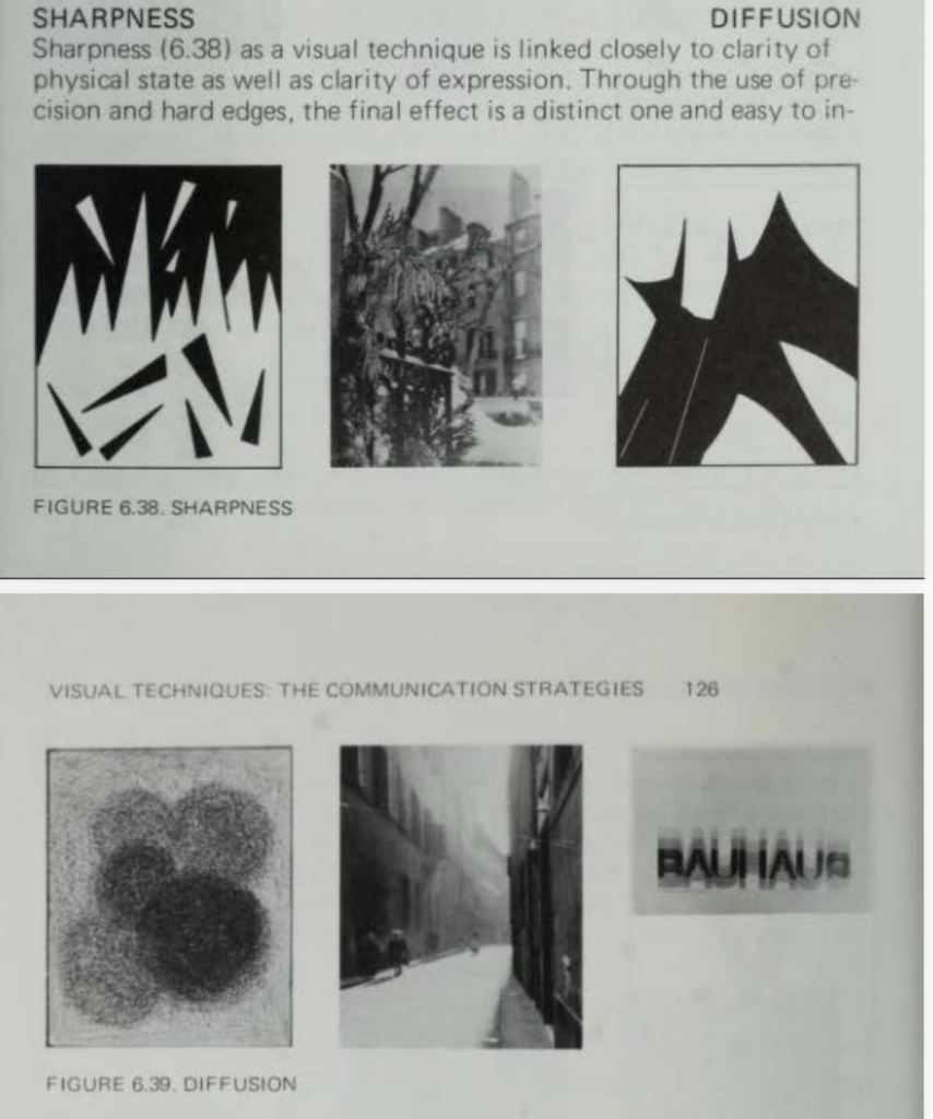Sharpness steht für visuelle Klarheit: harte Kanten, deutliche Konturen, hohe Kontraste und präzise Formen. Informationen sind klar voneinander getrennt, Objekte leicht identifizierbar. Wahrnehmung wird fokussiert und gelenkt. Diffusion beschreibt das Gegenteil: weiche Übergänge, unscharfe Konturen, geringe Kontraste, verschwimmende Formen. Visuelle Grenzen lösen sich auf, Bedeutung wird atmosphärisch statt explizit vermittelt. (Vgl. Dondis, 1973, pp. 125-126).