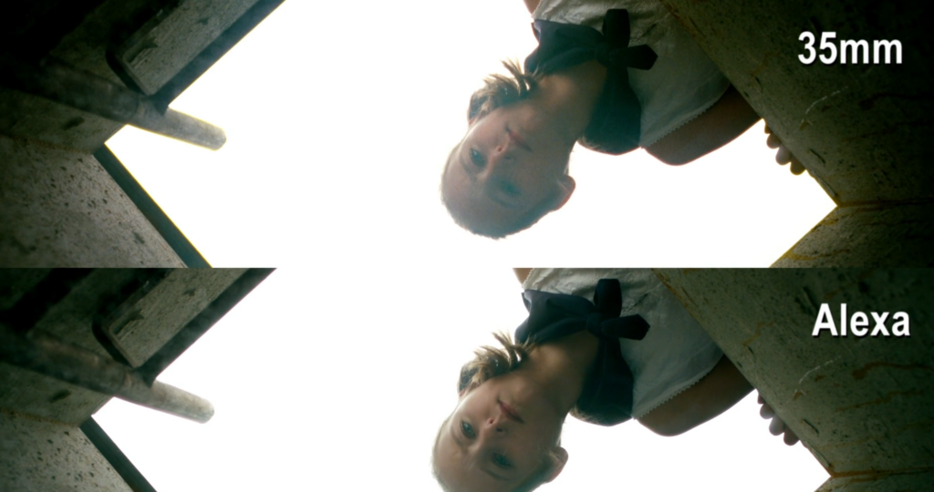 Bildstabilität und Textur: Das analoge Bild weist eine mechanisch bedingte Unruhe und ein veränderliches Filmkorn auf, wohingegen die digitale Aufnahme der ARRI Alexa eine „rock-steady“ Stabilität und eine klinische Klarheit liefert.