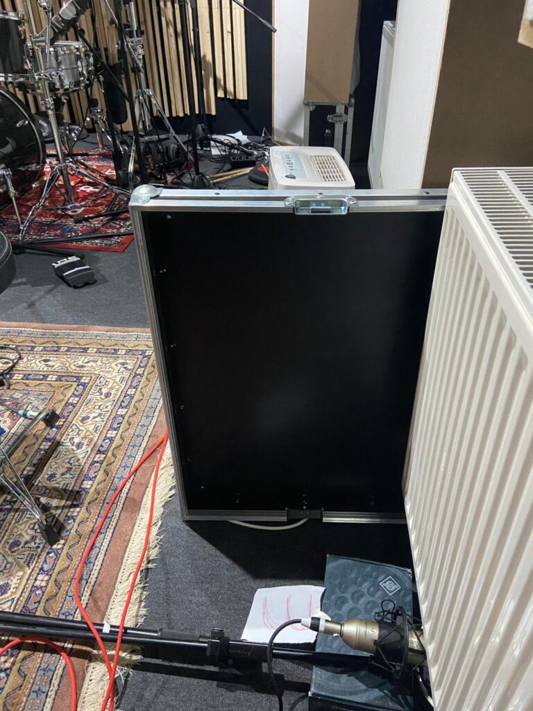 Due to the limited room size, achieving a clean separation between direct sound and room response proved challenging. Nevertheless, multiple strategies were tested, including shielding direct sound and placing microphones in acoustically reactive positions. Additional experiments were conducted by capturing resonant objects within the room, such as a large metal pot or a radiator, in order to introduce controlled resonances—through postproduction, the so-called “dirt”—into the drum sound.
