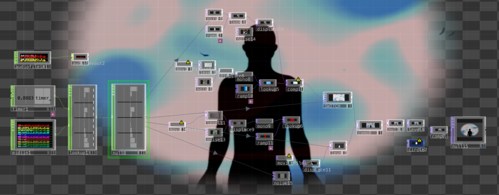 During the preparation of the installation, I decided to extend the project with a visual layer that supports and reinforces the sound. The visual component was conceived as a minimal, data-driven system that mirrors the same physiological dynamics shaping the audio, rather than functioning as an independent narrative. For this purpose, I used TouchDesigner, where I created a relatively simple visual patch controlled by HRV-derived parameters. Instead of implementing real-time data streaming, I reused the MIDI files generated during the sound design stage. These MIDI signals were imported into TouchDesigner, normalized from the MIDI range (0–127) to values between 0 and 1, and used to drive visual modulation.