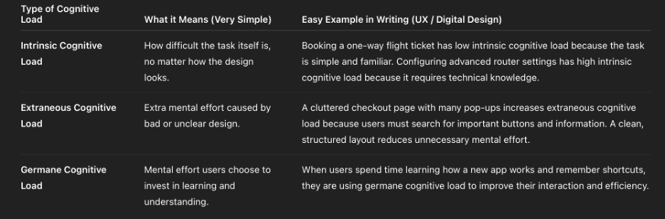 This image is the clear and short explanation of type of Cognitive Load based on wikipedia and Page: ( https://mailchimp.com)
