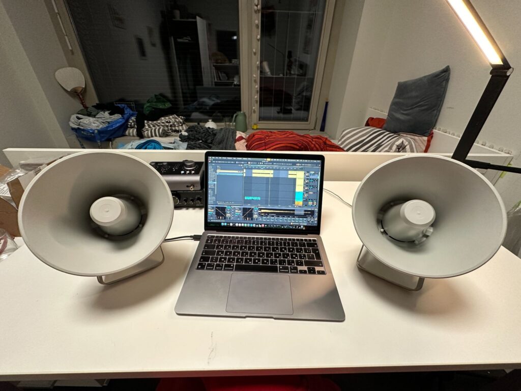 To strengthen the conceptual layer of the work, I deliberately chose not to use headphones or conventional loudspeakers. Instead, I used two horn loudspeakers (model shown in the figures). Such speakers are commonly used in stadiums or public announcement systems and strongly resemble urban warning sirens. In addition to their visual reference, these speakers have very specific timbral characteristics: they do not reproduce frequencies below approximately 300 Hz and are highly directional, which significantly shaped the listening experience.