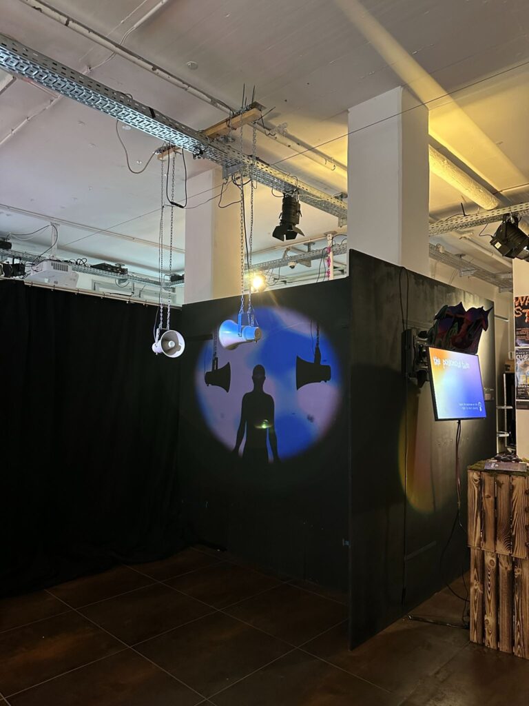 The visual and spatial elements were arranged so that the light from a projector was directed toward the wall and the speakers in a way that their shadows became visible. The projected human silhouette was positioned between the shadows of the speakers, creating a layered visual composition that added a poetic and symbolic dimension to the installation.
