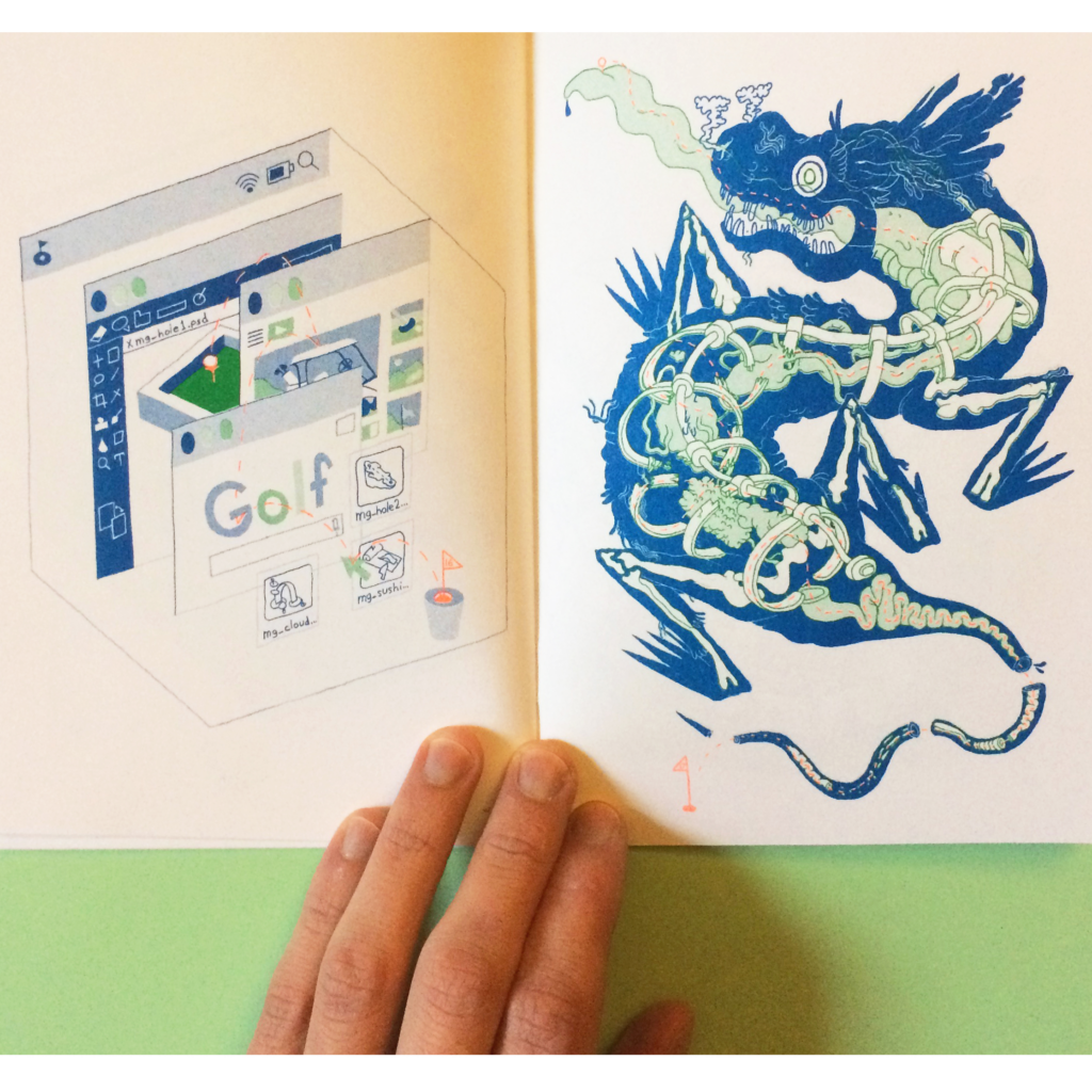 This zine is risograph printed in green, blue, and fluorescent orange in collaboration with Colour Code in Toronto.