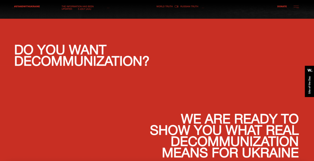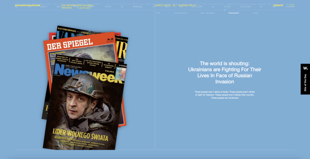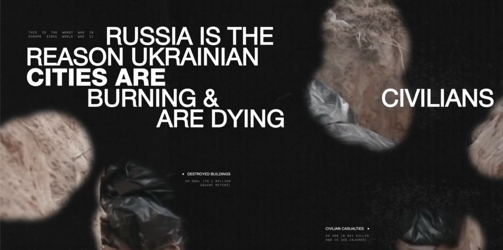 Diese Website ist ein non profit Projekt von “The First The Last” Agentur in USA. Sie macht das geschehen in der Ukraine auf eine weise erlebbar und sorgt somit auf eine emotionale Weise für Support durch User, die am Ende zur Hilfe aufgerufen werden.